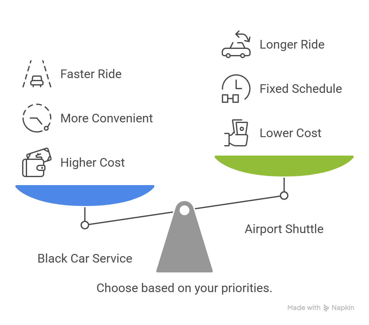 If you prioritize ease, privacy, and comfort, a black car service could be your best bet. This option offers a premium, no-fuss ride directly to your destination.